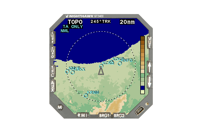 Enhancing safety and situational awareness, our revolutionary ST3400 TAWS/RMI is a compact, easy-to-install TAWS/RMI unit with a full-time, high-resolution terrain display. A 3-ATI-sized system that incorporates a TAWS computer and an oversized high-resolution, full-color display in a single panel-mounted unit, the ST3400 meets TSO C151b for both Class A and Class B requirements. Also incorporating RMI functionality, the ST3400 serves as a drop-in replacement for conventional RMI units, displaying terrain maps, topographic maps, navigation waypoint maps and TCAS data.