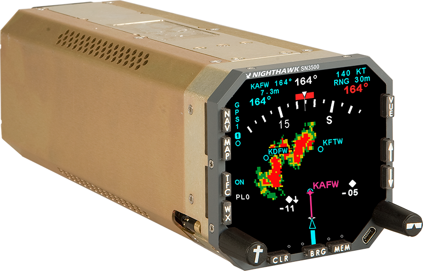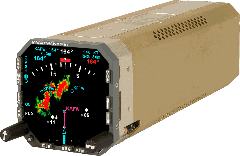 Incorporating the equivalent of a four-inch screen in a three-inch instrument, the SN3500 improves situational awareness by presenting compass, map, flight plan and RMI data in a bright, crisp, easy-to-read format. With LED backlighting the SN3500 is a proven and reliable drop-in replacement for your current 3-inch HSI. The SN3500 is both an easy and affordable retrofit for your aircraft or rotorcraft. Available with night vision option and TACAN support as well.
