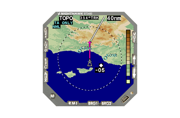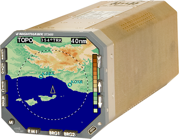 The industry’s best-selling integrated Terrain Awareness and Warning System (TAWS) for corporate, regional and air transport markets, the ST3400 is an integrated panel-mount system that outperforms cumbersome remote-mount TAWS systems that weigh and cost far more. A 3-ATI-size system that features a TAWS database, processor and oversized, high-resolution color display in a single unit, the ST3400 meets TSO C151b for both Class A and Class B requirements. Also incorporating RMI functionality, the ST3400 serves as a drop-in replacement for conventional RMI units, displaying terrain maps, topographic maps, navigation waypoint maps and TCAS data.