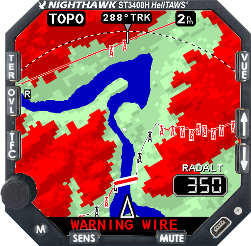 Advance defense against wire strikes that helps helicopter pilots avoid transmission lines whether they are powered on or off. WireWatch uses unique wire alerting algorithms that work proprietary 3-arc second wire database.